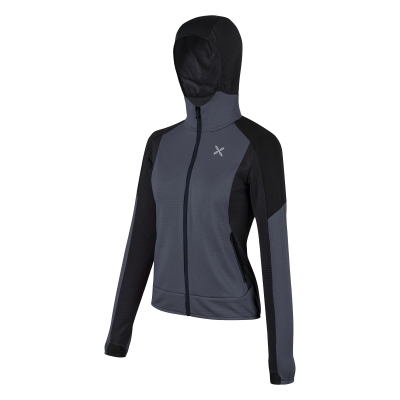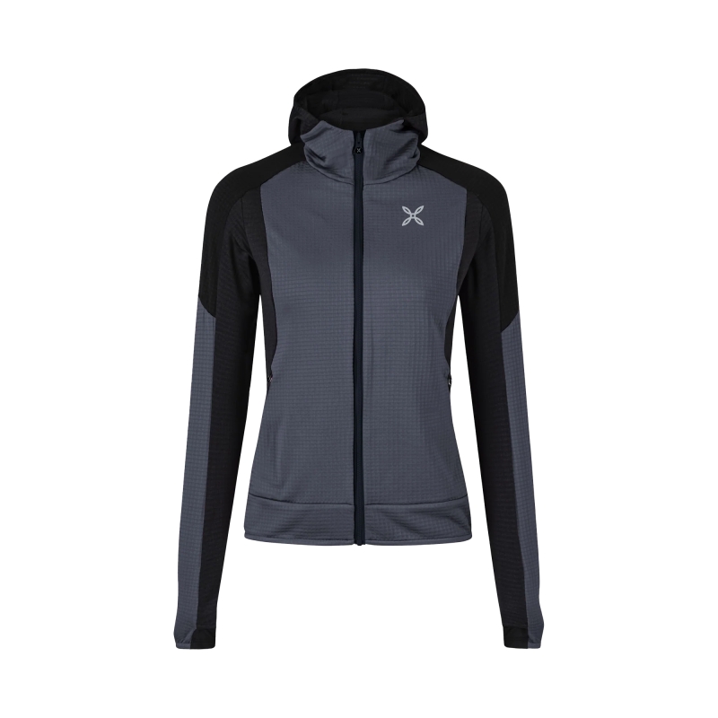 segunda capa elástico para mujer, ideal para esquí de montaña, montañismo y actividades al aire libre. Protección UV, cremallera central, bolsillos con cremallera y puños con orificios para los pulgares.