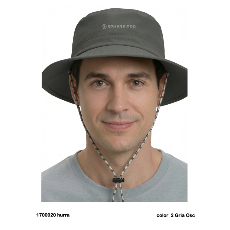 Descripción: Tejido tratado con DWR, protección UPF 50+, cordón ajustable en la barbilla( desmontable), botón a presión en los laterales, logo bordado.